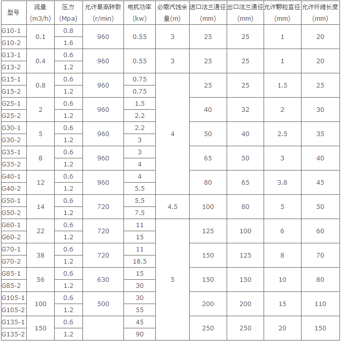 單、雙級水煤漿工作泵的性能參數