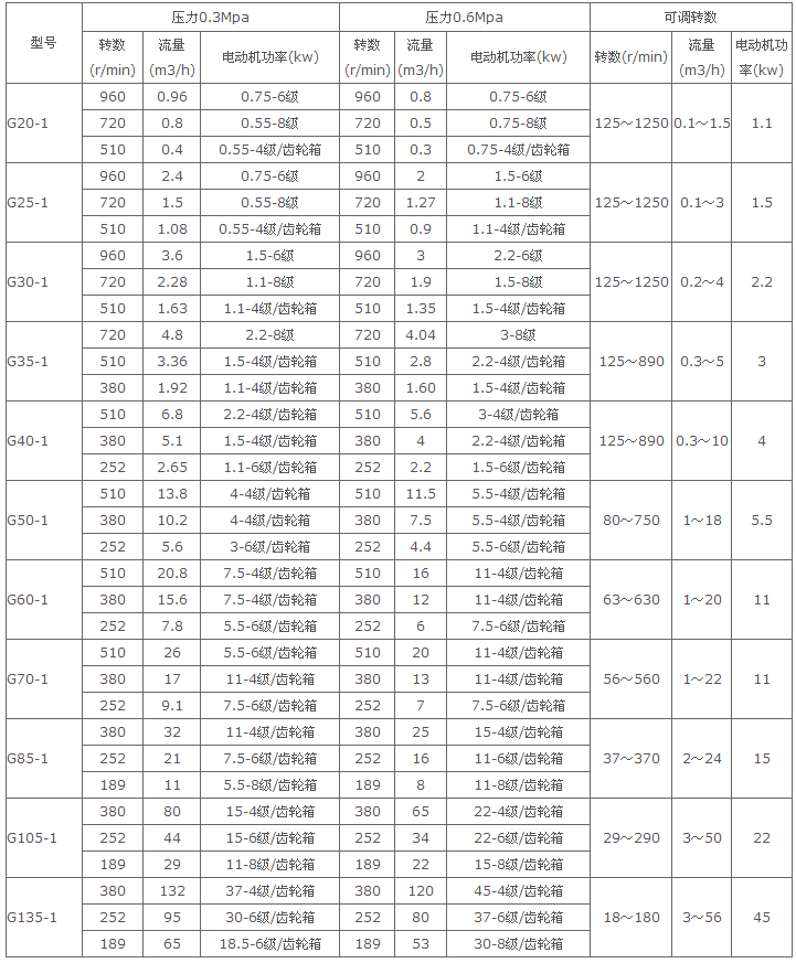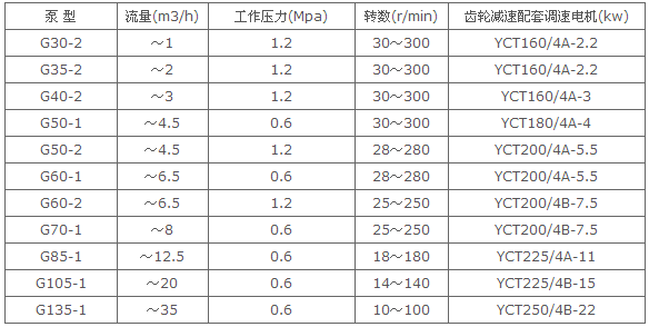 單級,由齒輪變速、電磁調速電機加齒輪變速或無級變速電機加齒輪變速時的性能參數